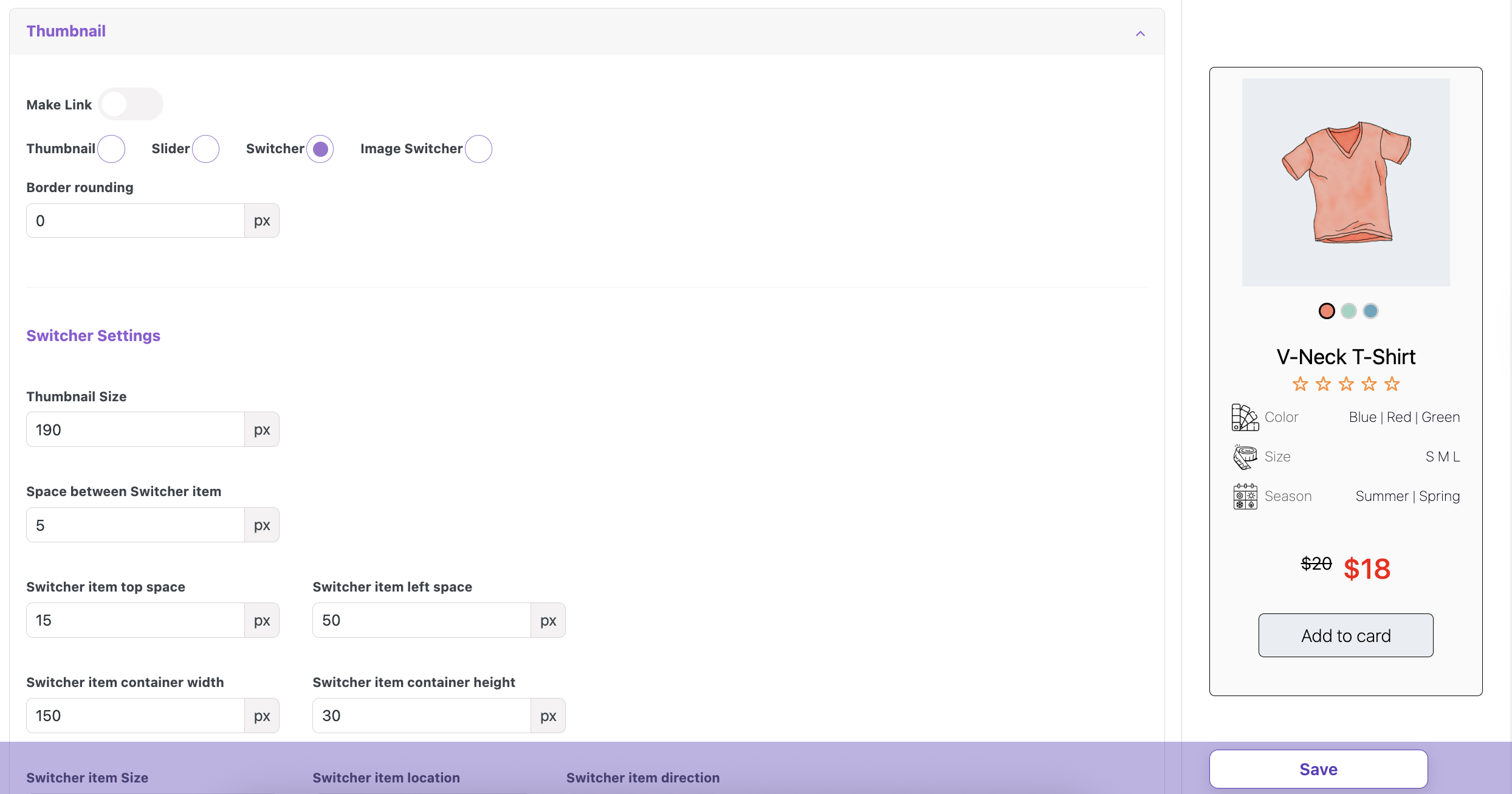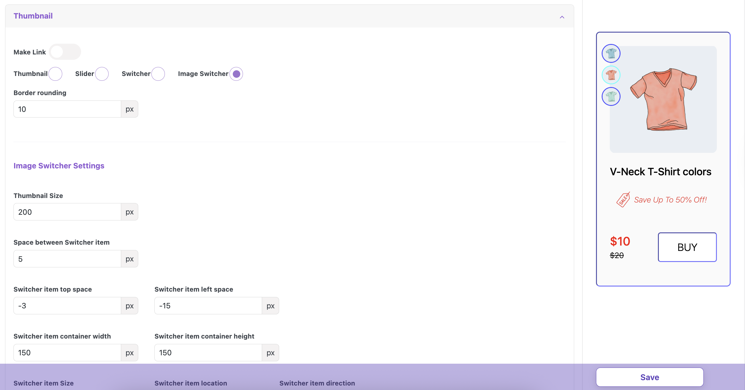 Space between Switcher item – sets the gap between the image switcher item size