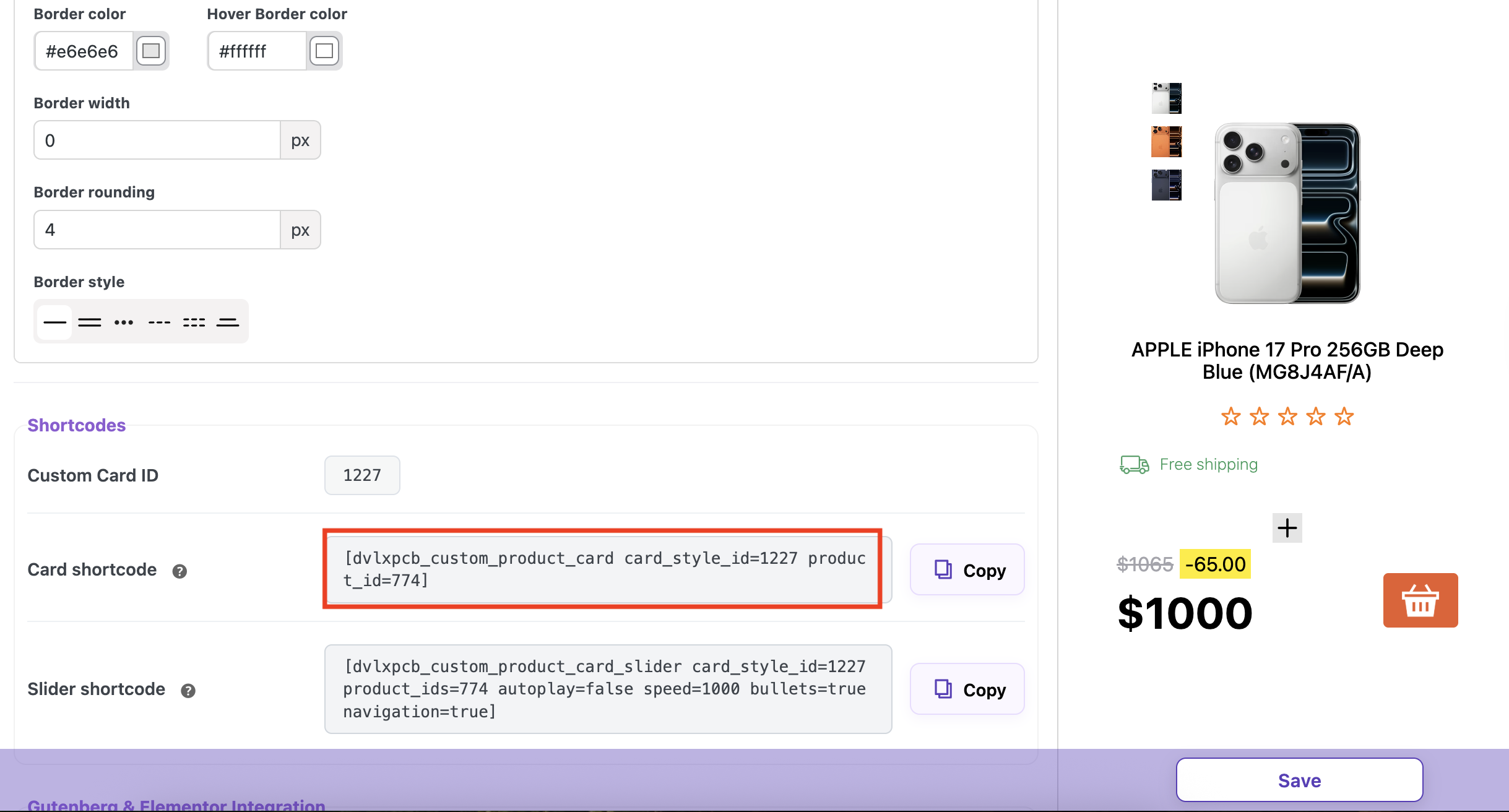 To display a custom card in the shop, save all settings and copy the shortcode